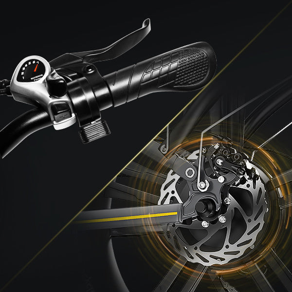 BRAKE & SHIMANO GEAR SYSTEM:Ebikes for adults 7 Speed gear increases hill-climbing power, further range variation, and greater terrain adaptability. According different road conditions, reduce the strength and pressure of your legs effectively. Together with the front and rear mechanical disc brake
