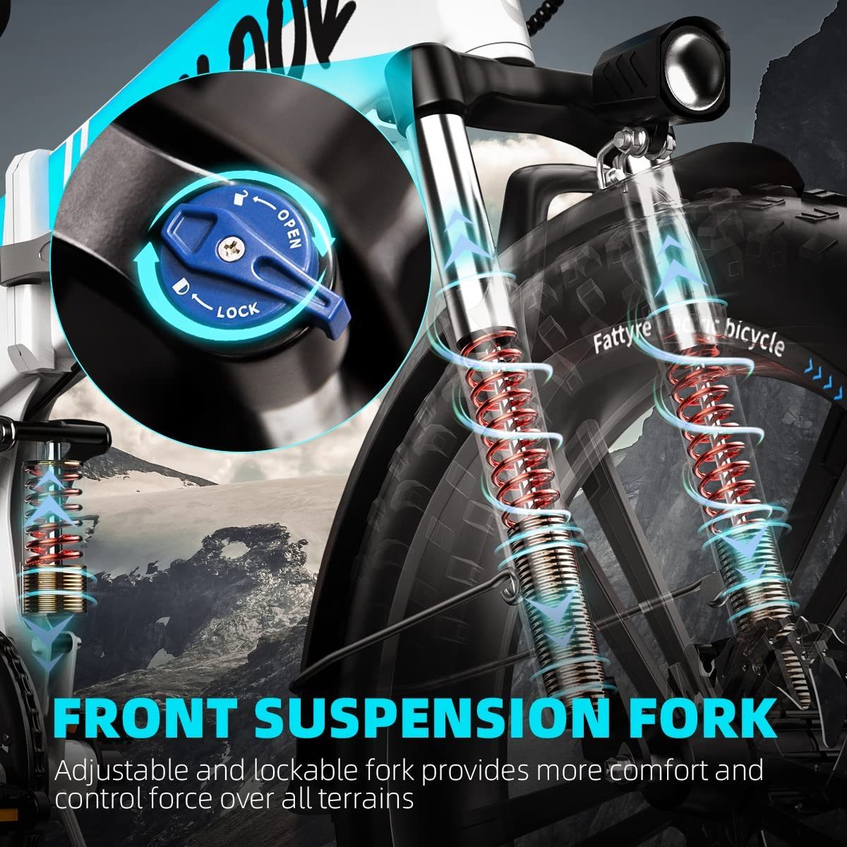 COMFORTABLE DUAL SUSPENSION:The e bikes for adults electric equips with an all-terrain front suspension fork and 760-pound adjustable shock absorber. Longer service life, better shock absorption. 20*4.0 inches fat tires help to provide a smoother and more comfortable riding experience to adjust all