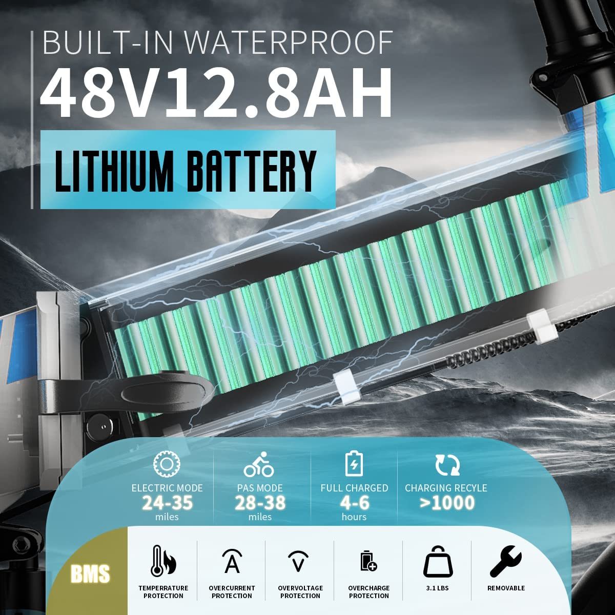 WATERPROOF 48V 12.8Ah LG LITHIUM BATTERY:With the upgraded 48V 12.8Ah LG waterproof battery,which is perfectly hidden in the frame to ensure the safety of the electrical system during fierce riding, also can provide ride range 24-35miles in electric mode, 35-48miles in PAS mode, combining the two m